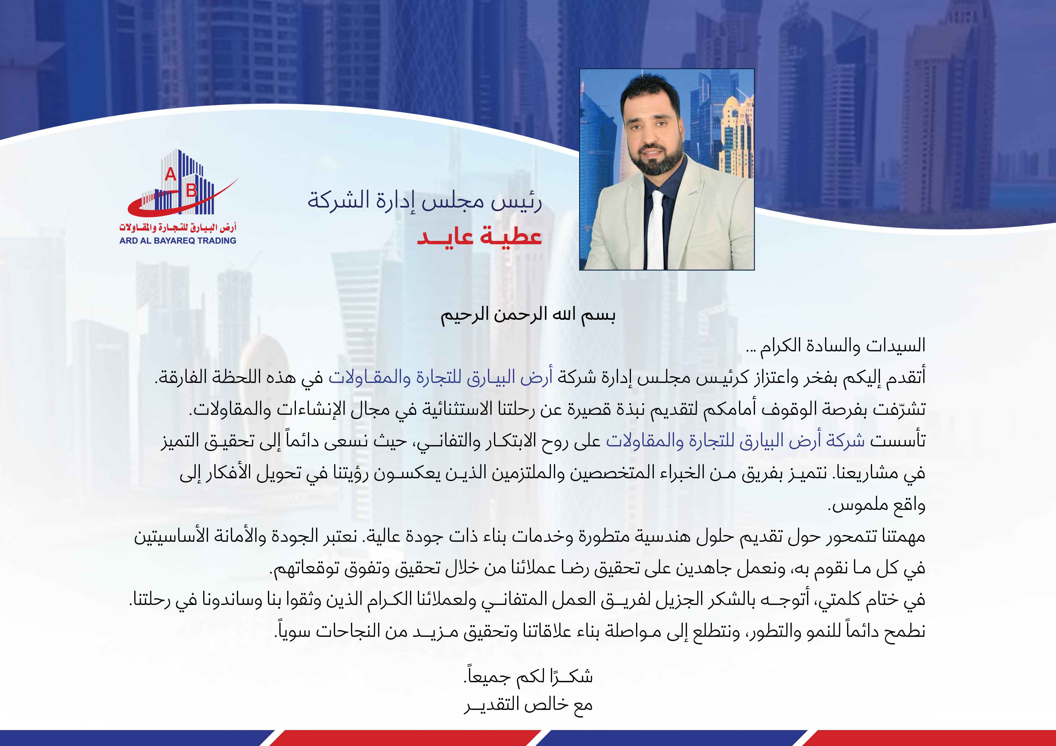 نحن أرض البيارق ذ.م.م شركة بناء متخصصة في تنفيذ وإدارة مشاريع البناء. نقدم خدماتنا للعملاء في قطاعات متنوعة مثل العقارات التجارية والسكنية والصناعية. نهدف إلى تحقيق أعلى معايير الجودة والمهنية في جميع جوانب عملنا. يتكون فريقنا من مجموعة من المهندسين المعماريين والمهندسين المدنيين والفنيين المهرة في مجالات البناء والتشييد ، نعمل بشكل وثيق مع عملائنا لفهم احتياجاتهم ومتطلباتهم المحددة ، ونضع خططًا مفصلة لتنفيذ المشاريع بطريقة فعالة وفقًا للميزانية المحددة والجدول الزمني. تشمل خدماتنا تصميم وتخطيط المشروع ، وتنفيذ كافة البنود الإنشائية ( عضم بلاستر - تشطيبات ) ، والإشراف على عمليات البناء والتشييد، وضمان الجودة والسلامة. نحرص على استخدام أحدث التقنيات والمواد ذات الجودة العالية لضمان تنفيذ المشاريع بأفضل طريقة ممكنة. نسعى لتحقيق رضا العملاء من خلال تقديم خدمات عالية الجودة والتعامل بمهنية وشفافية.